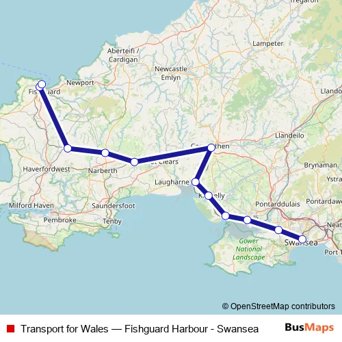 The first stop of the Transport for Wales rail route is Swansea and the last stop is Fishguard Harbour. Transport for Wales (Fishguard Harbour - Swansea) is operational during everyday.