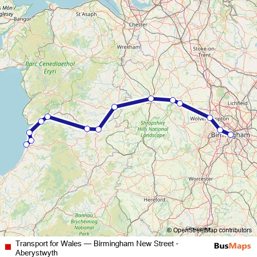 The first stop of the Transport for Wales rail route is Birmingham New Street and the last stop is Aberystwyth. Transport for Wales (Birmingham New Street - Aberystwyth) is operational during everyday.