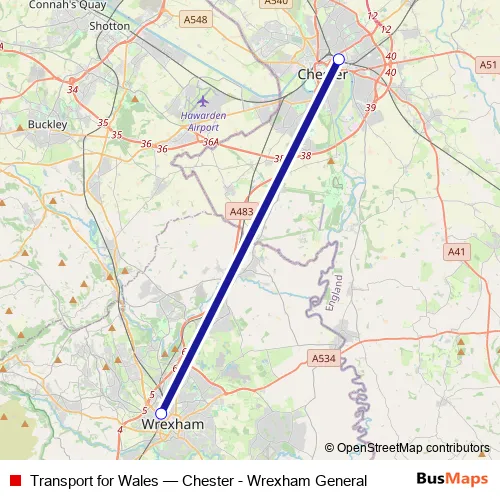 The first stop of the Transport for Wales rail route is Chester and the last stop is Wrexham General. Transport for Wales (Chester - Wrexham General) is operational during everyday.