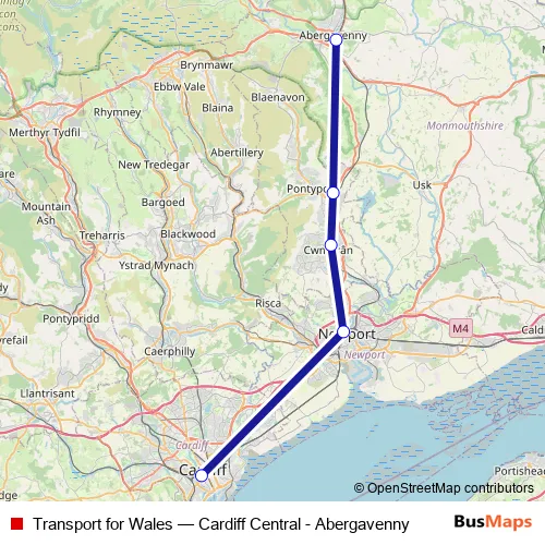 The first stop of the Transport for Wales rail route is Cardiff Central and the last stop is Abergavenny. Transport for Wales (Cardiff Central - Abergavenny) is operational during on weekdays.