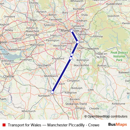 The first stop of the Transport for Wales rail route is Crewe and the last stop is Manchester Piccadilly. Transport for Wales (Manchester Piccadilly - Crewe) is operational during everyday.