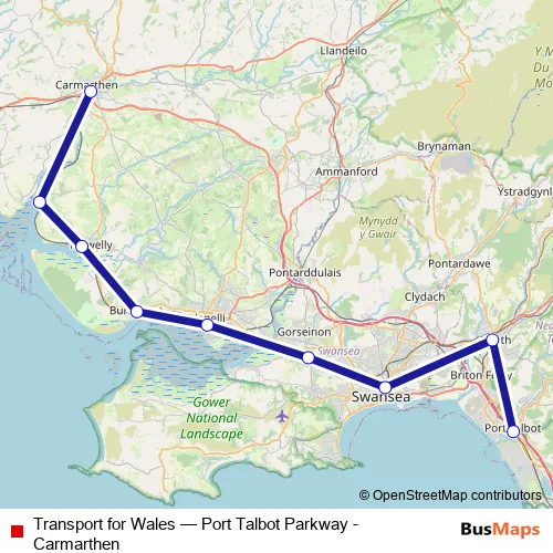 The first stop of the Transport for Wales rail route is Port Talbot Parkway and the last stop is Carmarthen. Transport for Wales (Port Talbot Parkway - Carmarthen) is operational during everyday.