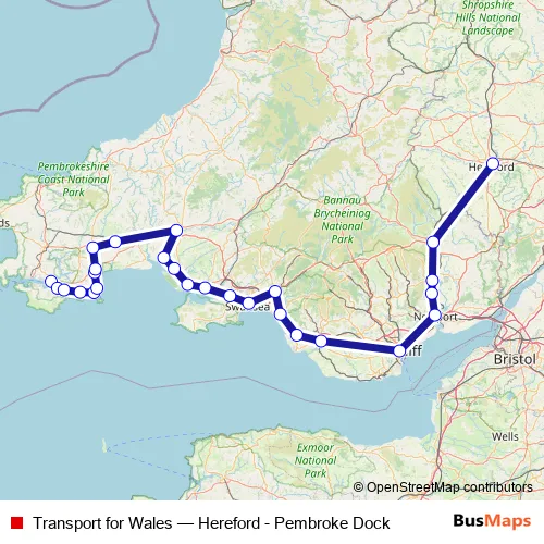 The first stop of the Transport for Wales rail route is Pembroke Dock and the last stop is Hereford. Transport for Wales (Hereford - Pembroke Dock) is operational during on weekends.