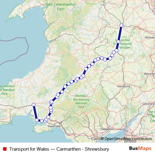 The first stop of the Transport for Wales rail route is Carmarthen and the last stop is Shrewsbury. Transport for Wales (Carmarthen - Shrewsbury) is operational during on weekdays.