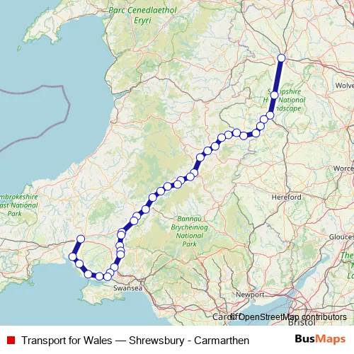 The first stop of the Transport for Wales rail route is Shrewsbury and the last stop is Carmarthen. Transport for Wales (Shrewsbury - Carmarthen) is operational during everyday.