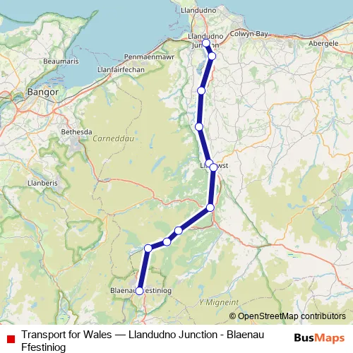 The first stop of the Transport for Wales rail route is Llandudno Junction and the last stop is Blaenau Ffestiniog. Transport for Wales (Llandudno Junction - Blaenau Ffestiniog) is operational during everyday.