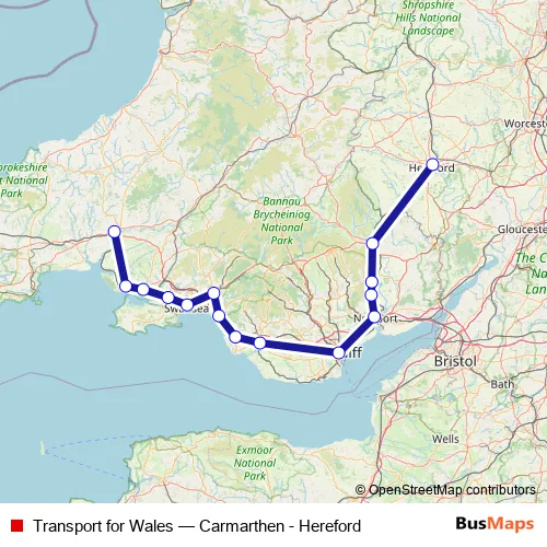 The first stop of the Transport for Wales rail route is Carmarthen and the last stop is Hereford. Transport for Wales (Carmarthen - Hereford) is operational during on weekends.