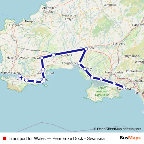 The first stop of the Transport for Wales rail route is Swansea and the last stop is Pembroke Dock. Transport for Wales (Pembroke Dock - Swansea) is operational during everyday.