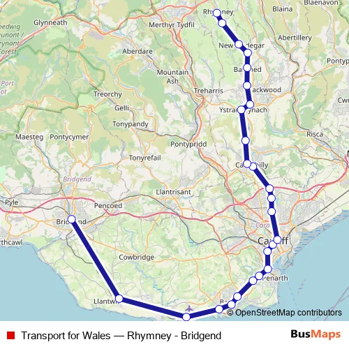 The first stop of the Transport for Wales rail route is Bridgend and the last stop is Rhymney. Transport for Wales (Rhymney - Bridgend) is operational during everyday.
