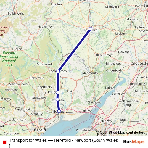 The first stop of the Transport for Wales rail route is Newport (South Wales) and the last stop is Hereford. Transport for Wales (Hereford - Newport (South Wales)) is operational during on weekends.