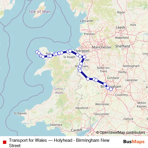 The first stop of the Transport for Wales rail route is Holyhead and the last stop is Birmingham New Street. Transport for Wales (Holyhead - Birmingham New Street) is operational during everyday.