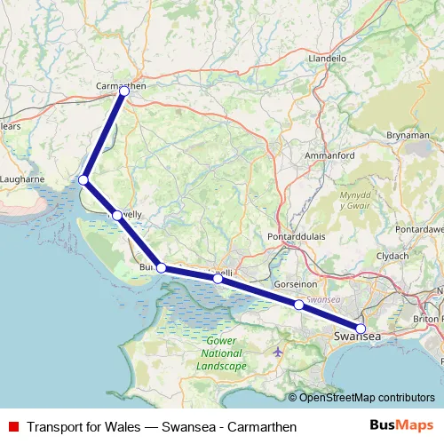 The first stop of the Transport for Wales bus route is Swansea and the last stop is Carmarthen. Transport for Wales (Swansea - Carmarthen) is operational during everyday.
