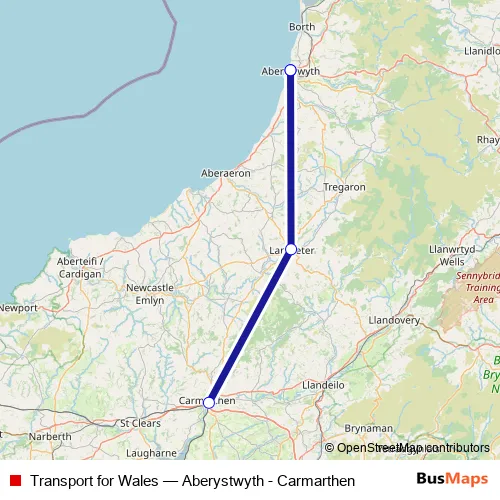 The first stop of the Transport for Wales bus route is Carmarthen and the last stop is Aberystwyth. Transport for Wales (Aberystwyth - Carmarthen) is operational during everyday.