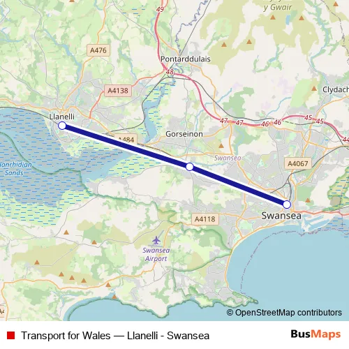 The first stop of the Transport for Wales bus route is Llanelli and the last stop is Swansea. Transport for Wales (Llanelli - Swansea) is operational during on weekdays.