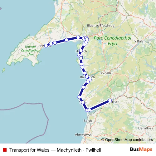 The first stop of the Transport for Wales bus route is Machynlleth and the last stop is Pwllheli. Transport for Wales (Machynlleth - Pwllheli) is operational during on weekends.