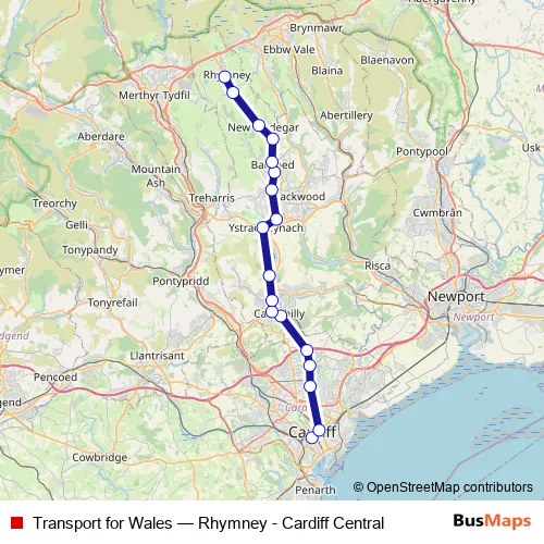 The first stop of the Transport for Wales bus route is Cardiff Central and the last stop is Rhymney. Transport for Wales (Rhymney - Cardiff Central) is operational during everyday.