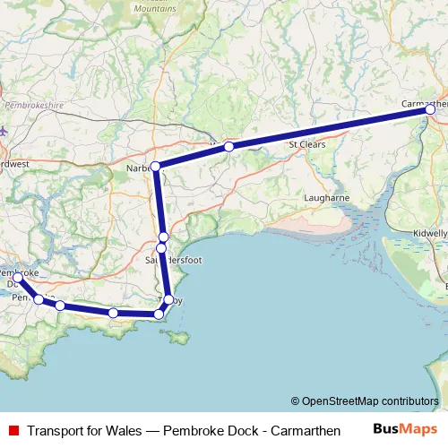 The first stop of the Transport for Wales bus route is Pembroke Dock and the last stop is Carmarthen. Transport for Wales (Pembroke Dock - Carmarthen) is operational during on weekdays.
