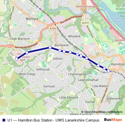 The first stop of the U1 bus route is Stephenson Place and the last stop is Bus Station. U1 (Hamilton Bus Station - UWS Lanarkshire Campus) is operational during on weekdays.