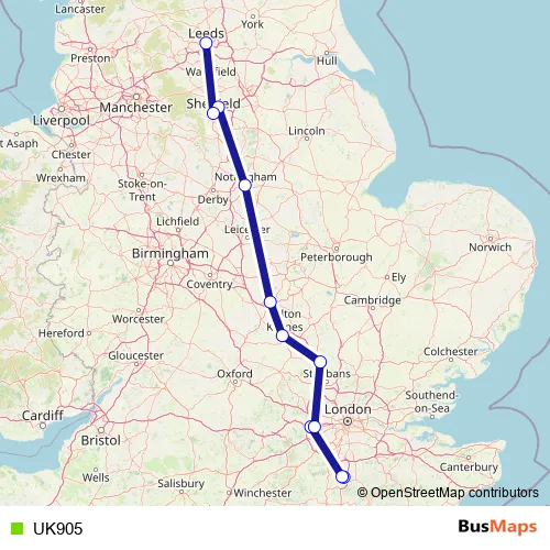 Services on the UK905 bus stop at 02:25 +1 on Monday, Tuesday, Wednesday, Thursday, Friday, Saturday, Sunday.