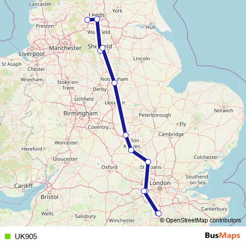 Additional information: UK905 has 12 stops and the total trip duration for this route is approximately 525 minutes.