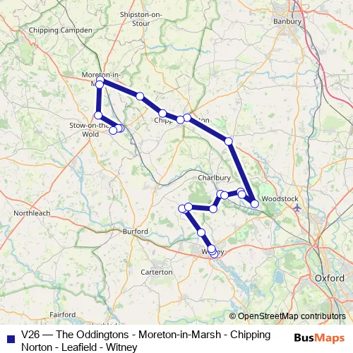 Click here to view the nearest V26 - The Oddingtons - Moreton-in-Marsh - Chipping Norton - Leafield - Witney bus stop.