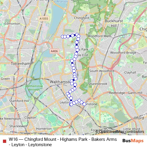 The first stop of the W16 bus route is Chingford Mount and the last stop is Leytonstone Station / Grove Green Road. W16 (Chingford Mount - Highams Park - Bakers Arms - Leyton - Leytonstone) is operational during everyday.