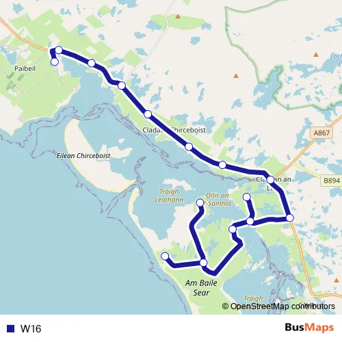 The first stop of the W16 bus route is Sgoil Uibhist a Tuath and the last stop is Illeray Side Road. W16 is operational during on weekdays.