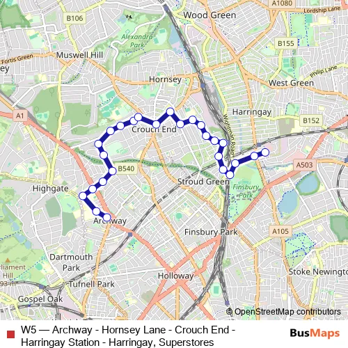 The first stop of the W5 bus route is Archway Station and the last stop is Harringay Sainsbury's. W5 (Archway - Hornsey Lane - Crouch End - Harringay Station - Harringay, Superstores) is operational during everyday.