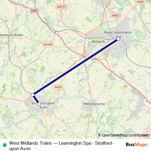 The first stop of the West Midlands Trains rail route is Leamington Spa and the last stop is Stratford-upon-Avon. West Midlands Trains (Leamington Spa - Stratford-upon-Avon) is operational during on weekdays.