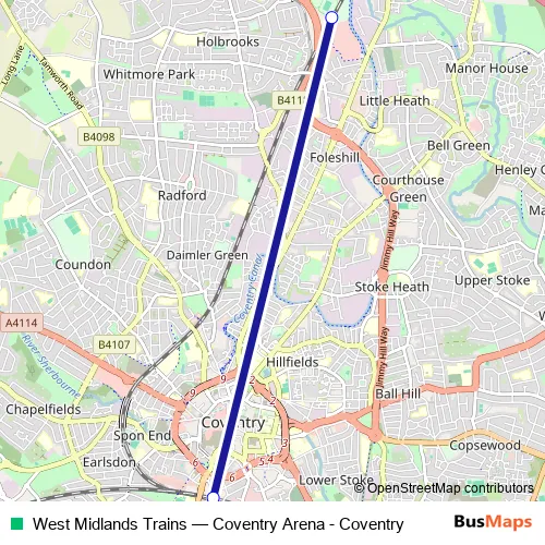 The first stop of the West Midlands Trains rail route is Coventry Arena and the last stop is Coventry. West Midlands Trains (Coventry Arena - Coventry) is operational during everyday.