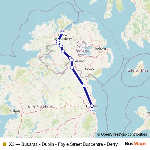 The first stop of the X3 bus route is Foyle Street Bus Station and the last stop is Dublin Busaras Bus Station. X3 (Busaras - Dublin - Foyle Street Buscentre - Derry) is operational during everyday.
