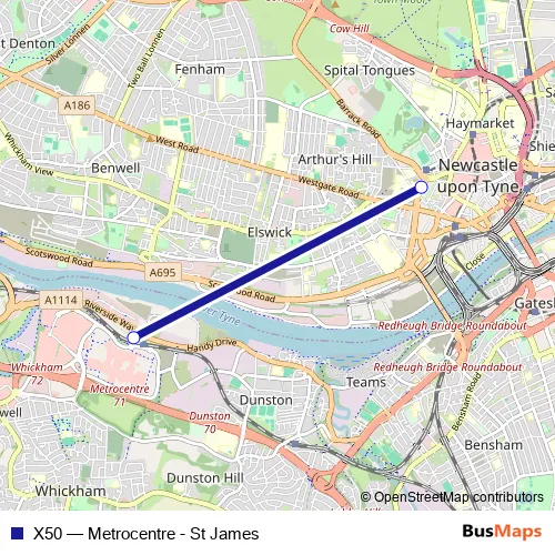 See why over 2 million users trust and consider busmaps.com as the best public transport website. busmaps gives you Newcastle upon Tyne Buses suggested routes, real-time bus tracker, line route maps in Newcastle upon Tyne, and helps to find the closest X50 bus stops near you. No internet available? Download an offline PDF map and bus schedule for the X50 bus to take on your trip.
