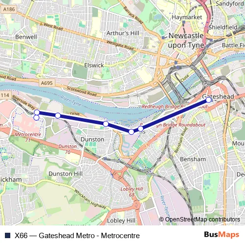 See why over 2 million users trust and consider busmaps.com as the best public transport website. busmaps gives you Newcastle upon Tyne Buses suggested routes, real-time bus tracker, line route maps in Newcastle upon Tyne, and helps to find the closest X66 bus stops near you. No internet available? Download an offline PDF map and bus schedule for the X66 bus to take on your trip.
