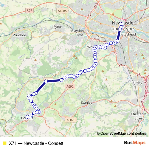 Click here to view the nearest X71 - Newcastle - Consett bus stop.
