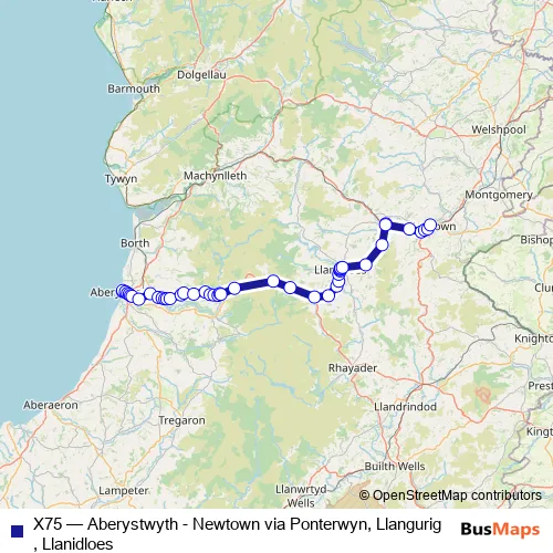 Click here to view the nearest X75 - Aberystwyth - Newtown via Ponterwyn, Llangurig, Llanidloes bus stop.