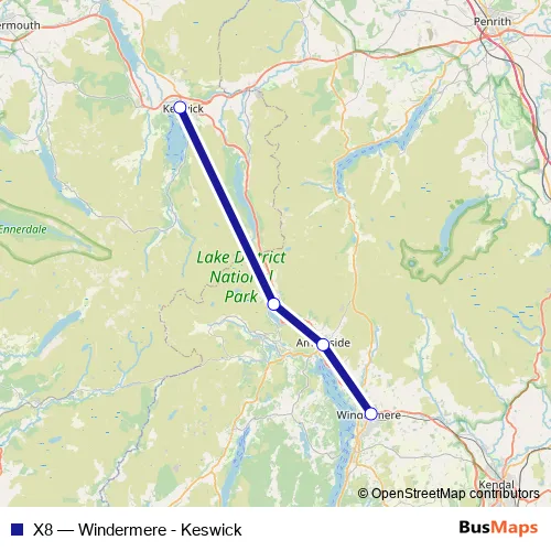 The first stop of the X8 bus route is Bus Station (K) and the last stop is Bus Rail Interchange. X8 (Windermere - Keswick) is operational during everyday.