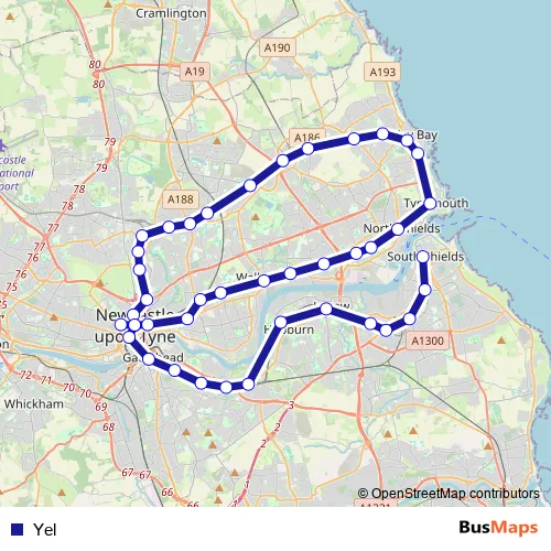 The first stop of the Yel metro route is St James (Tyne and Wear Metro Station) and the last stop is South Shields (Tyne and Wear Metro Station). Yel is operational during everyday.