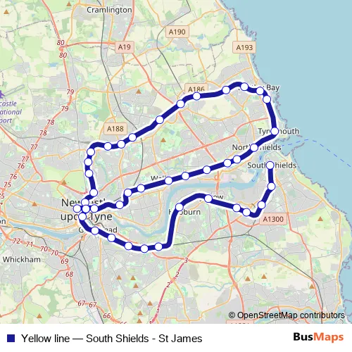 The first stop of the Yellow line metro route is St James (Tyne and Wear Metro Station) and the last stop is South Shields (Tyne and Wear Metro Station). Yellow line (South Shields - St James) is operational during everyday.