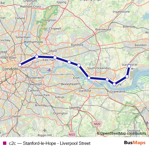 The first stop of the c2c rail route is Liverpool Street and the last stop is Stanford-le-Hope. c2c (Stanford-le-Hope - Liverpool Street) is operational during everyday.