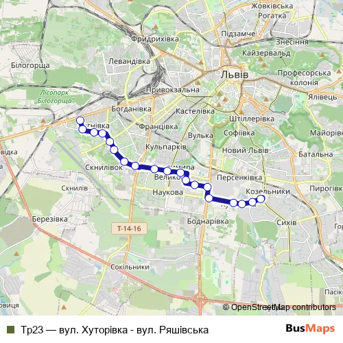 Click here to view the nearest Тр23 - вул. Хуторівка - вул. Ряшівська bus stop.