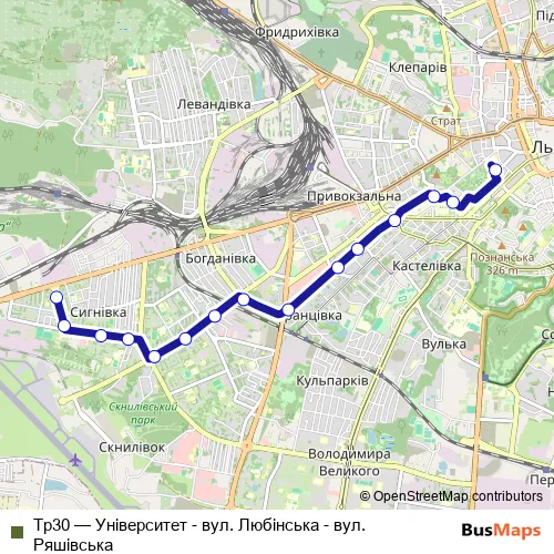 The first stop of the Тр30 bus route is Ряшівська (169) and the last stop is Університет (78-01). Тр30 (Університет - вул. Любінська - вул. Ряшівська) is operational during everyday.