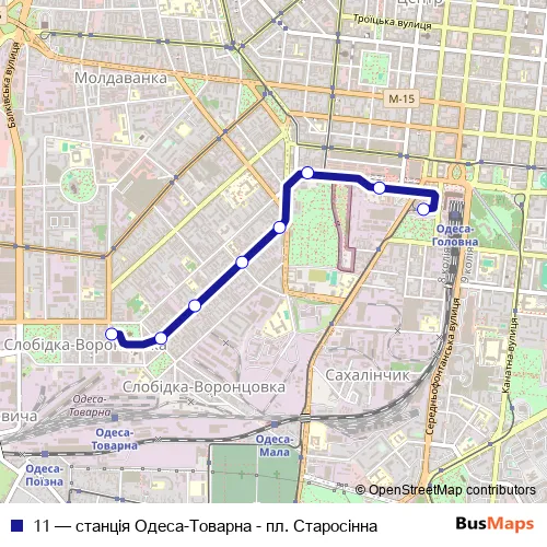 The first stop of the 11 tram route is пл. Старосінна and the last stop is станція Одеса-Товарна. 11 (станція Одеса-Товарна - пл. Старосінна) is operational during everyday.