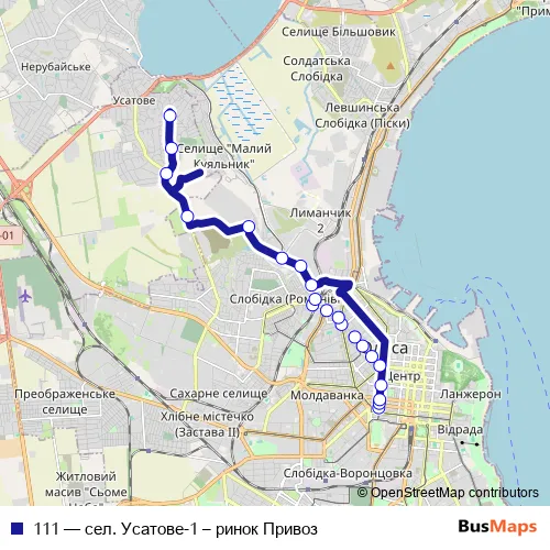 The first stop of the 111 bus route is Ринок Привоз and the last stop is Церква. 111 (сел. Усатове-1 – ринок Привоз) is operational during on weekends.