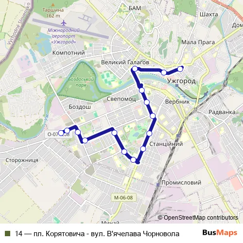 See why over 2 million users trust and consider busmaps.com as the best public transport website. busmaps gives you Uzhhorod Buses suggested routes, real-time bus tracker, line route maps in Uzhhorod, and helps to find the closest 14 bus stops near you. No internet available? Download an offline PDF map and bus schedule for the 14 bus to take on your trip.
