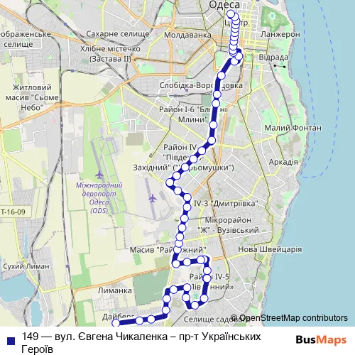 See why over 2 million users trust and consider busmaps.com as the best public transport website. busmaps gives you Odesa Buses suggested routes, real-time bus tracker, line route maps in Odesa, and helps to find the closest 149 bus stops near you. No internet available? Download an offline PDF map and bus schedule for the 149 bus to take on your trip.