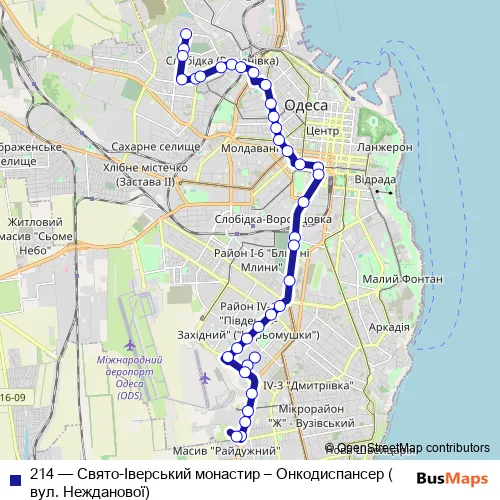 Bus 214 - Свято-Іверський монастир – Онкодиспансер (вул. Нежданової) Schedule in Odesa