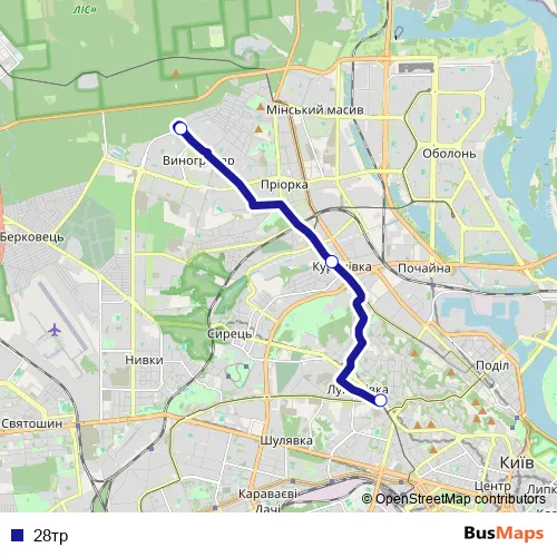 See why over 2 million users trust and consider busmaps.com as the best public transport website. busmaps gives you Kyiv Buses suggested routes, real-time bus tracker, line route maps in Kyiv, and helps to find the closest 28тр bus stops near you. No internet available? Download an offline PDF map and bus schedule for the 28тр bus to take on your trip.