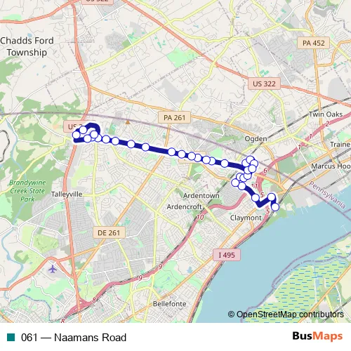The first stop of the 061 bus route is Claymont Transportation Center and the last stop is Brandywine Town Center Park & Ride. 061 (Naamans Road) is operational during on weekdays.