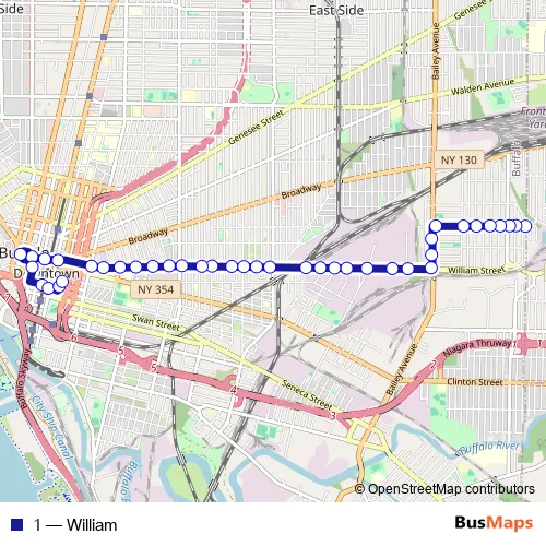 The first stop of the 1 bus route is East Lovejoy Street & Goethe Loop Station and the last stop is Ellicott Street & MTC Static. 1 (William) is operational during everyday.