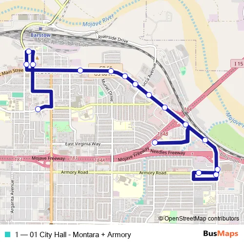 See why over 2 million users trust and consider busmaps.com as the best public transport website. busmaps gives you Barstow Buses suggested routes, real-time bus tracker, line route maps in Barstow, and helps to find the closest 1 bus stops near you. No internet available? Download an offline PDF map and bus schedule for the 1 bus to take on your trip.